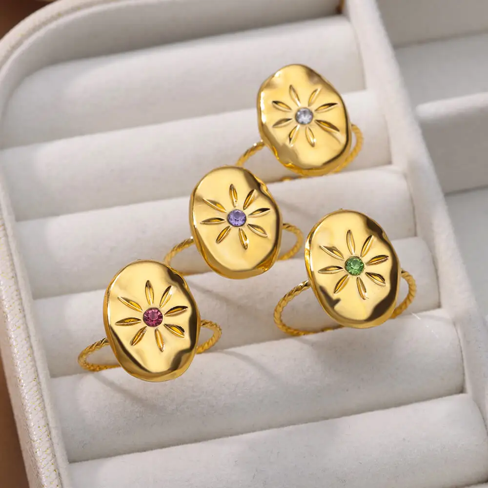 Início>Produtos>Anéis De Pedra De Opala De Aço Inoxidável Para As Mulheres Banhado A Ouro Sun